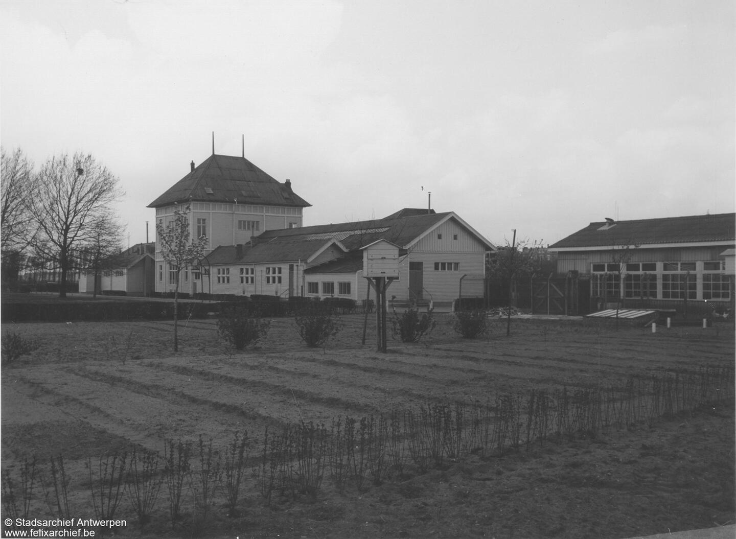 Foto's uit het gerechtelijk dossier: de school met aanduiding van de vluchtweg (B) en de kast waaruit wapens werden gestolen. © Rijksarchief te Antwerpen, Archief van het Parket van de Procureur des Konings te Antwerpen, Bundel “Overval op Politieschool”, Weerstandsorganisaties 295B 1957, Antwerpen.